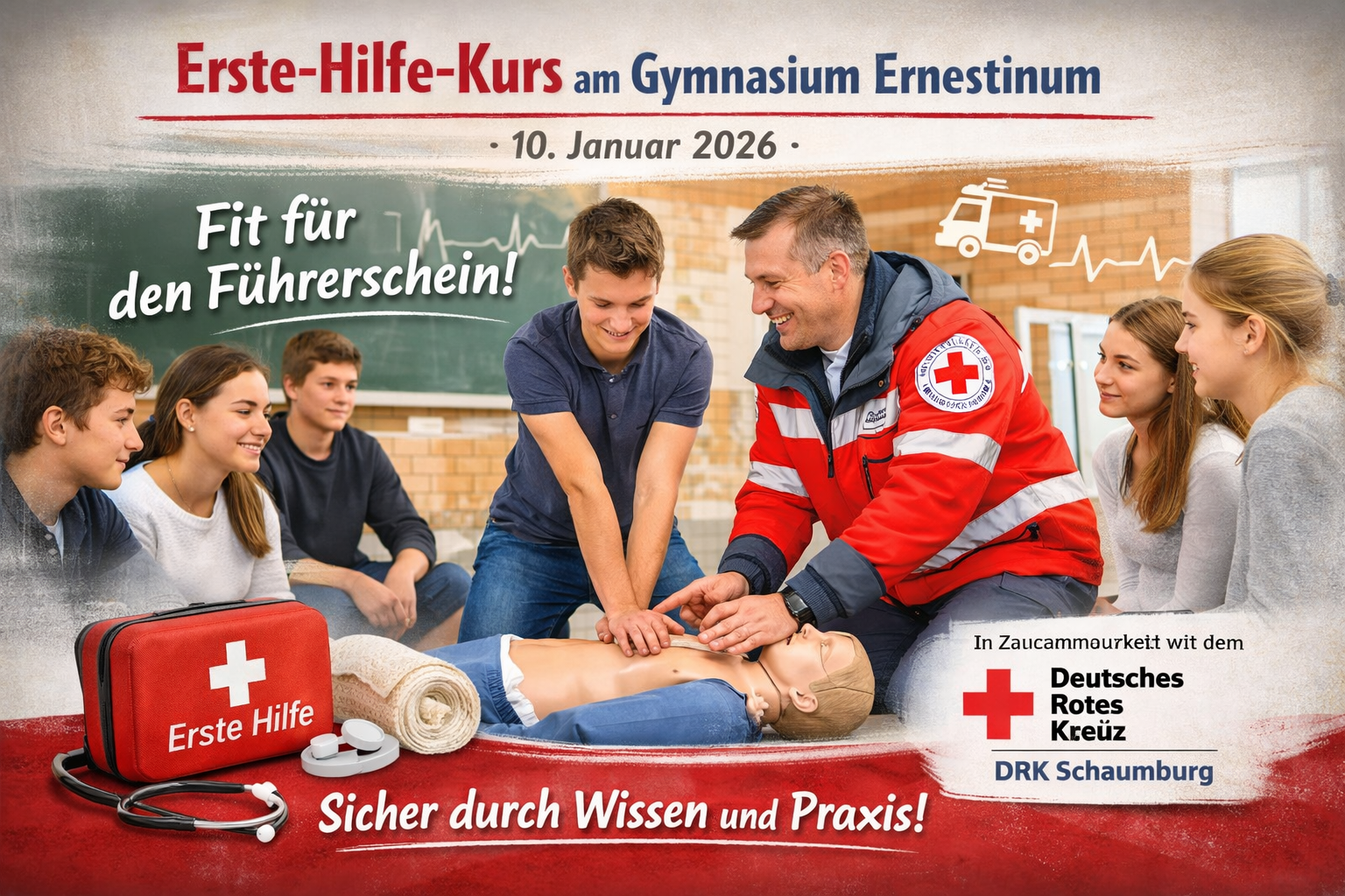 Am Samstag, 10. Januar 2026, findet am Gymnasium Ernestinum ein ganztägiger Erste-Hilfe-Kurs für Schüler:innen statt. Von 8.00 bis 15.30 Uhr lernen 17 engagierte Teilnehmer:innen, wie sie in Notfällen sicher und kompetent handeln können – eine wichtige Voraussetzung für den Erwerb des Führerscheins.