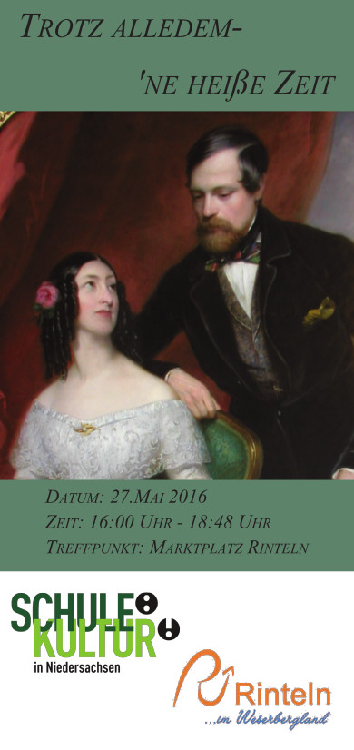 Und zwischendurch laden wir zu einem Stadtrundgang der besonderen Art durch Rinteln ein. In Zusammenarbeit mit der Staatsoper und dem Staatstheater Hannover sowie dem heimischen Museum Eulenburg erarbeiteten Schülergruppen mit ihren Lehrkräften und dem Dramaturgen Dietmar Goergen einen Stadtrundgang, unterbrochen von kurzen Schauspielszenen, musikalischen Einlagen und einer Ausstellung zu wichtigen Personen der Rintelner Stadtgeschichte. Hierbei wurde der Fokus vor allem auf ehemalige Schüler und Lehrer des Gymnasiums gelegt, die in der turbulenten Zeit des Vormärz in Rinteln – und z.T. an der Schule – lebten und wirkten. Auch die Sage „Der Kobold in der Mühle“, gesammelt von den Gebrüdern Grimm, wird inszeniert.