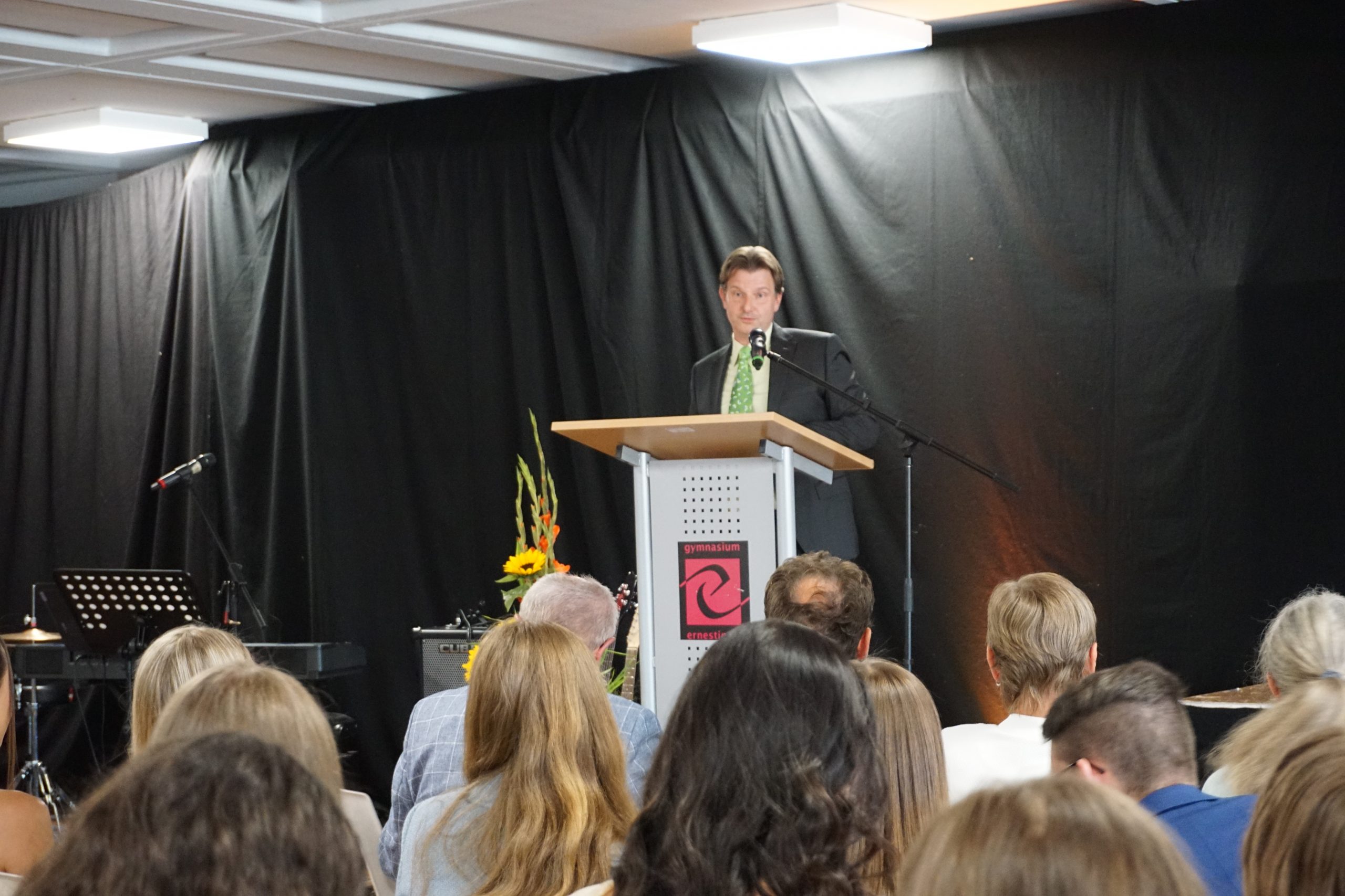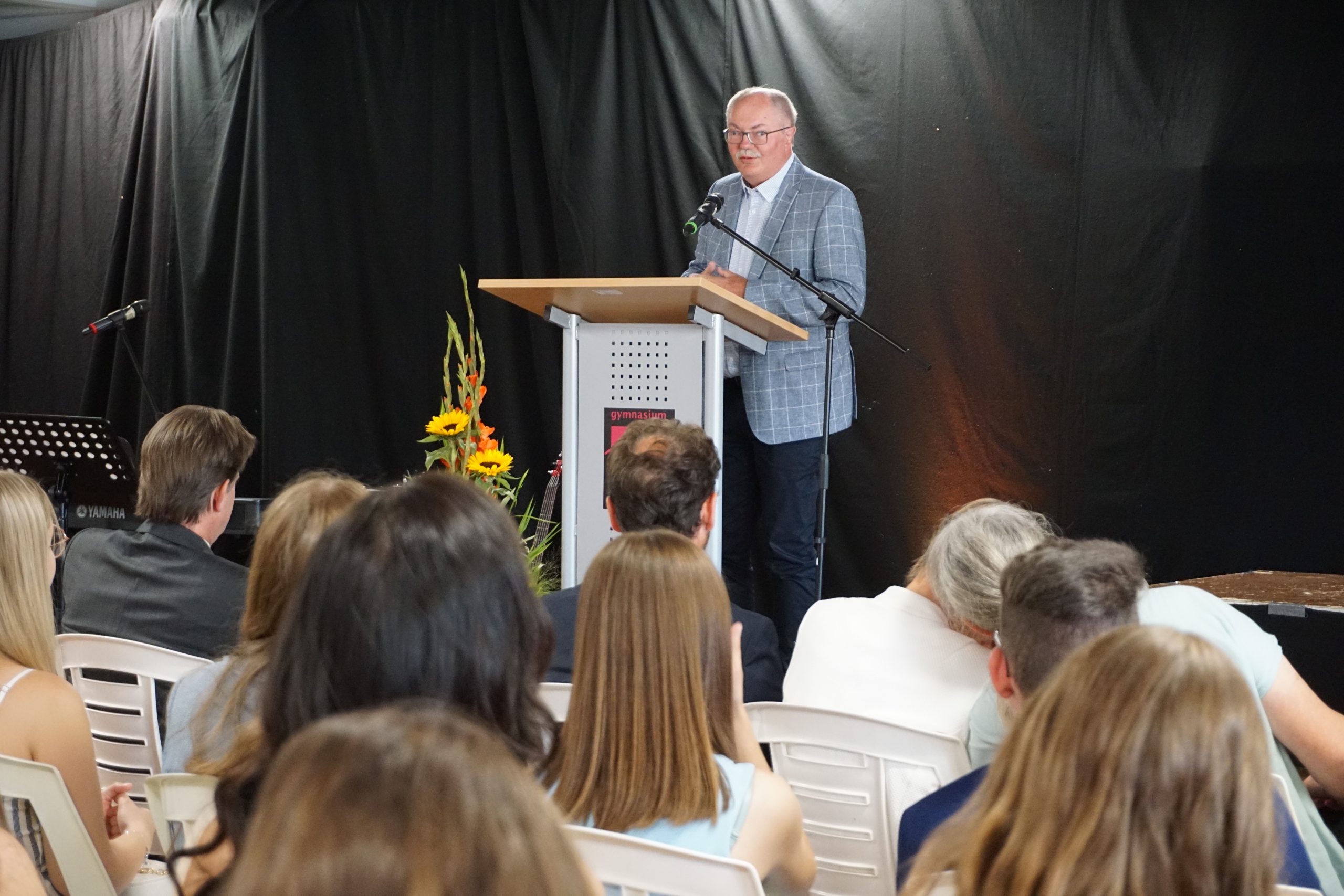 Studiendirektor Lars Büttner hielt als Leiter des Absolventenjahrgangs die Verabschiedungsrede für die Schulleitung. Neben den erwartet überaus positiven Bemerkungen über das Auetal, verwies er auf mehrere Momente, die für diesen Jahrgang in Erinnerung bleiben sollten. Abschließend drückte er seine herzlichsten Glückwünsche für die Zukunft der Absolventen aus.