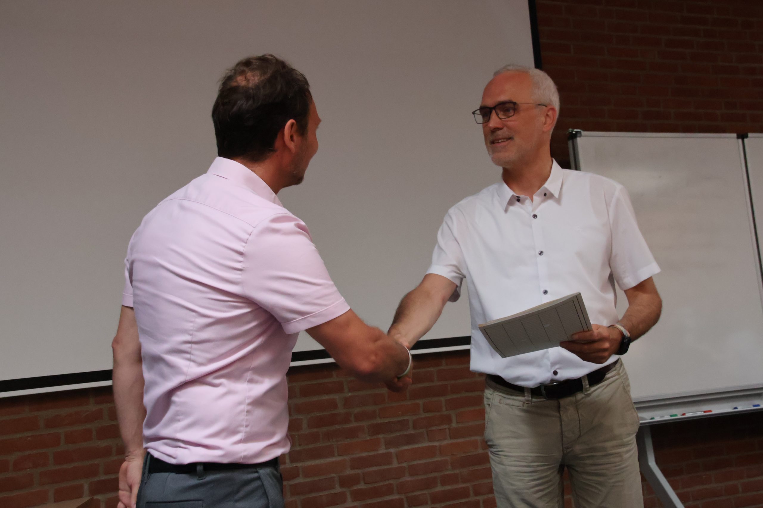 Doch das Ernestinum wird nach den Sommerferien nicht ohne einen Kapitän ins neue Schuljahr starten, sondern der Staffelstab wurde auf der letzten Dienstbesprechung des Schuljahres 2024/25 durch den erneuten Besuch des Dezernenten Kindermann offiziell übergeben: Herr Lars Niemann wird neuer Schulleiter des Gymnasiums Ernestinum. Zum 01.08.2025 (und damit erfreulicherweise völlig nahtlos) geht das Amt des Schulleiters auf ihn über. Im selben Zuge bestätigte Herr Kindermann auch die Neubesetzung des Dienstpostens des ständigen Stellvertreters der Schulleitung, denn auch hier wird es keine Leerstelle geben: Herr Daniel Ellermann wird zum neuen Schuljahr 2025/26 an der Seite von Lars Niemann das Ernestinum und seine Besatzung durch alle Winde und an neue Ufer führen, die der Schulalltag mit sich bringen mag.