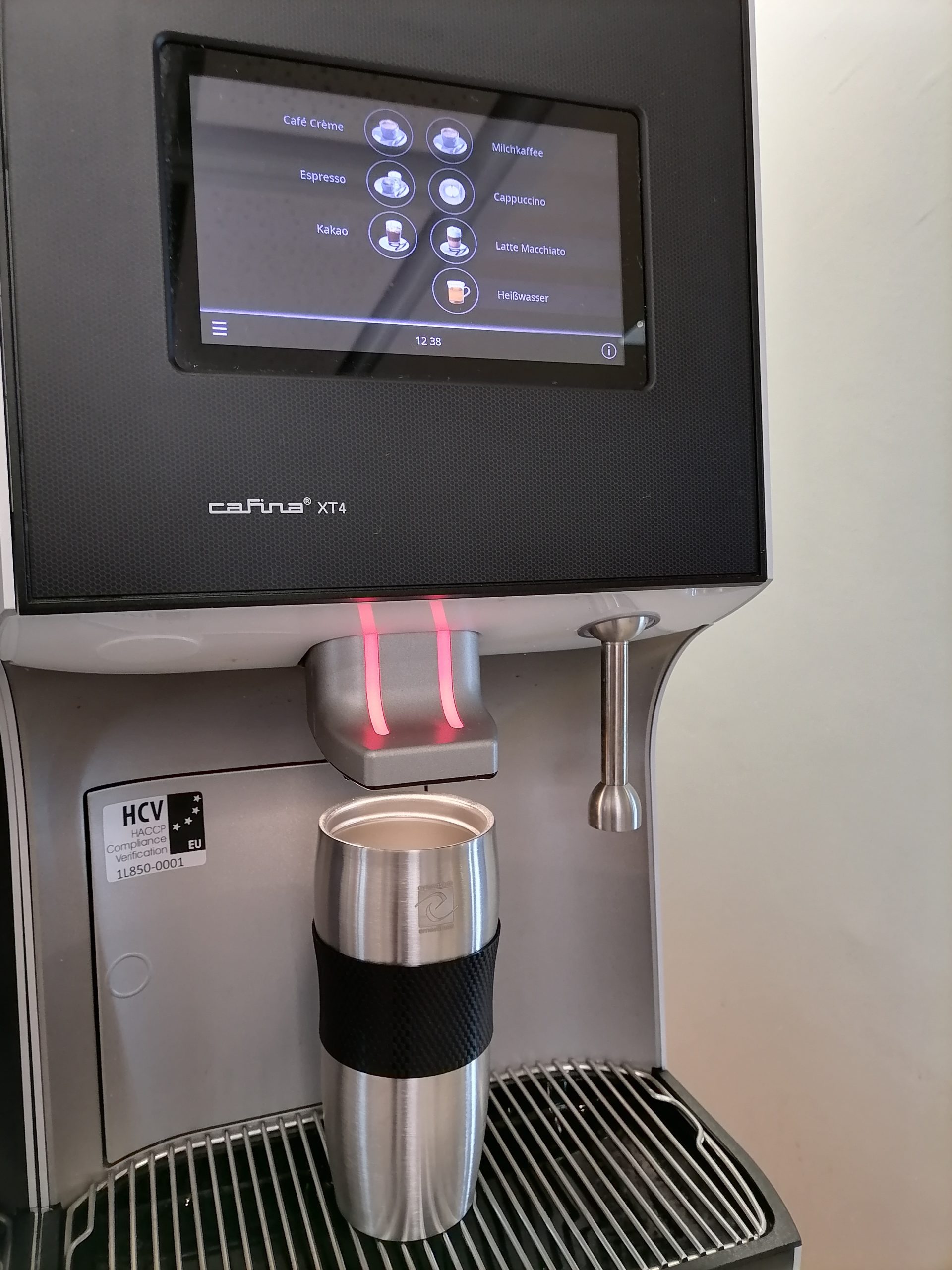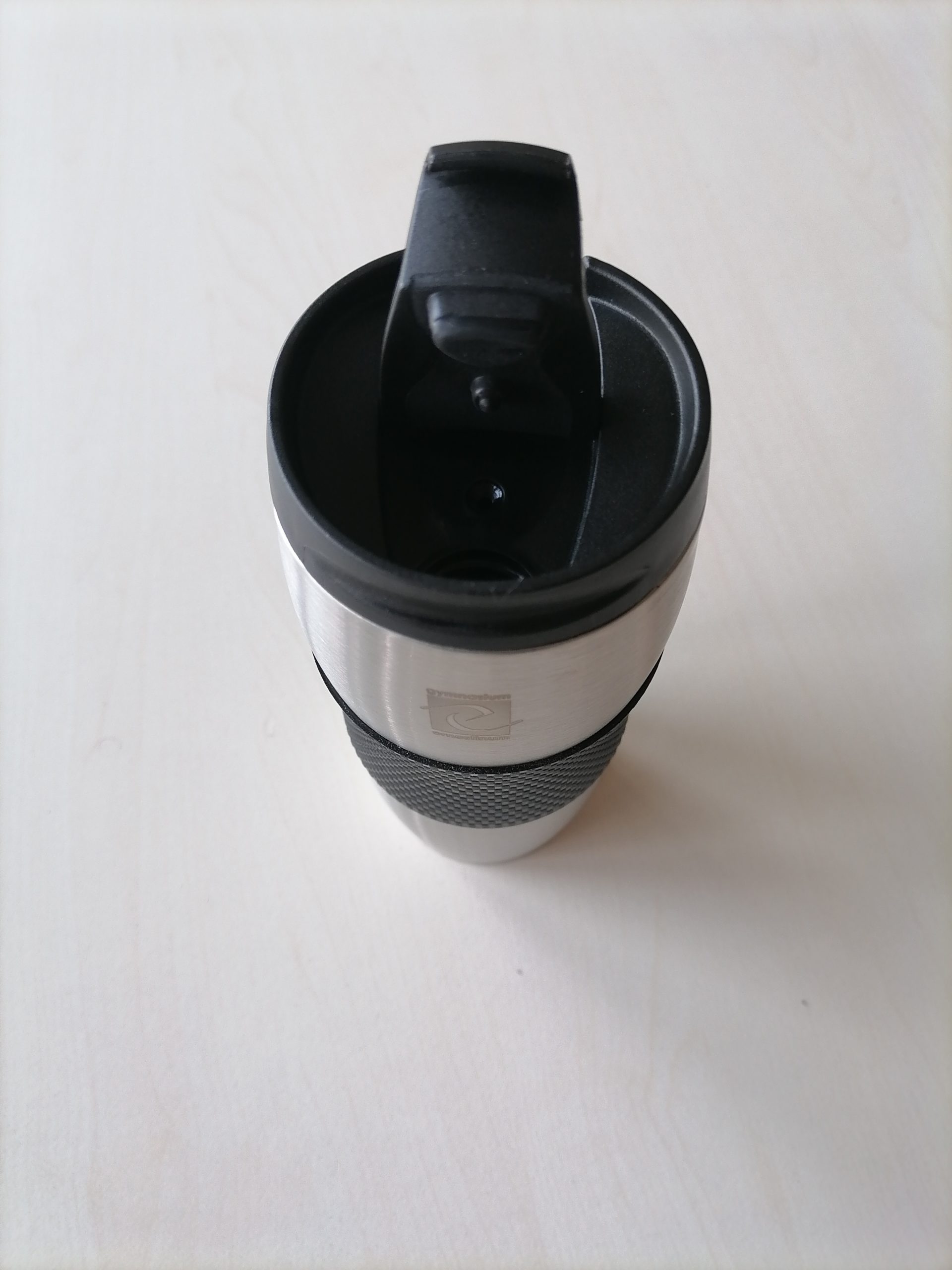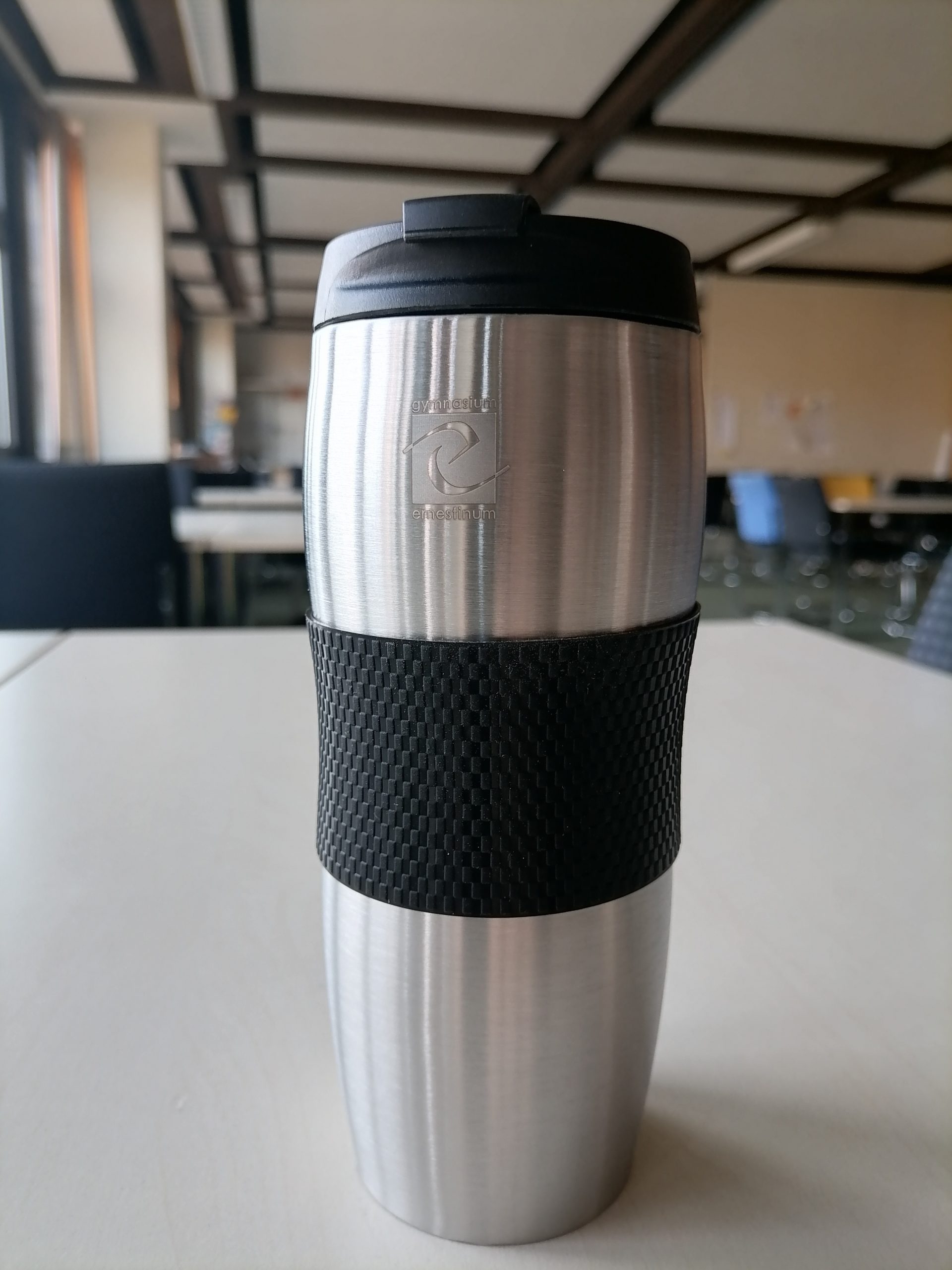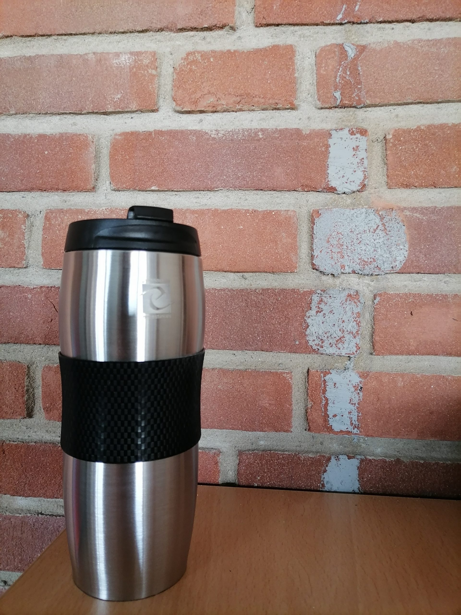 doppelwandig: innen und außen aus Edelstahl, farbig abgesetzter Kunststoff-Deckel mit sicherem Schraubverschluss und integrierter Trinköffnung, farbig-gummierte Manschette für beste Griffigkeit sowie gummierter Standfuß für gute Bodenhaftung