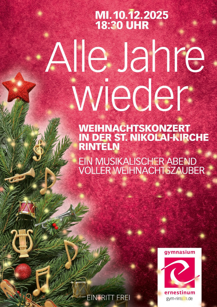Der Fachbereich Musik lädt ein zum traditionellen Weihnachtskonzert am Mittwoch, dem 10. Dezember 2025 um 18.30 in der Rintelner Nikolai-Kirche. Auftreten werden unter anderem die Bläserklasse 6-3 und der neu formierte Abi-Chor.