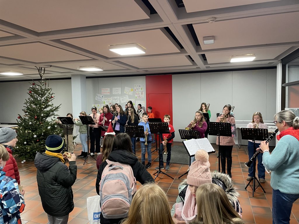Während der letzte Schultag nicht unbedingt von Schnee oder Sonne geprägt sein sollte und somit zwei Regenpausen stattfanden, entschied sich die Bläserklasse dazu, für die erste große Pause einen kleinen Flashmob zu planen. So tummelten sich nach dem Klingeln immer mehr Schüler/innen mit Instrumenten vor der Abtrennung zum aktuell im Bau befindlichen Forum und stimmten unter Leitung von Frau Presse-Requardt gemeinsam ein paar Weihnachtslieder an – was für eine schöne vorweihnachtliche Überraschung für alle, die wegen des Regenwetters nicht auf den Schulhof wollten.